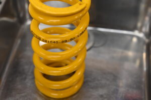 ローダウン後の姿勢条件に合わせて、フォークの突き出し量(姿勢)を再調整しました。あわせてスプリングの特性も見直し、狙った動き出しと「支え感」が出るように整えました。
