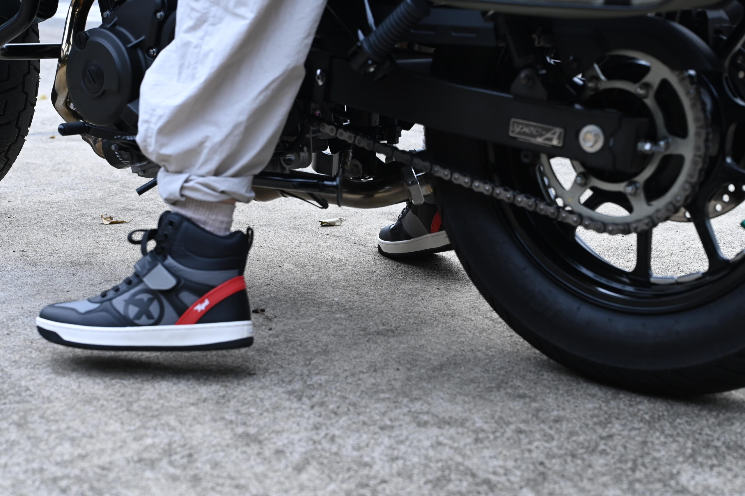 エリミネーター400のローダウンに関して、弊社では費用対効果を追求した「LTD」方式のローダウンを提供しております。今回のモデルはシート高を30mm下げることで、身長157cmの方でも快適に足が届くようになり、バイクの免許がない方でもその安心感を実感しています。ライディングシューズは一般的なものを使用しており、極端な厚底ではないにもかかわらず、しっかりと地面に足が接地しています。