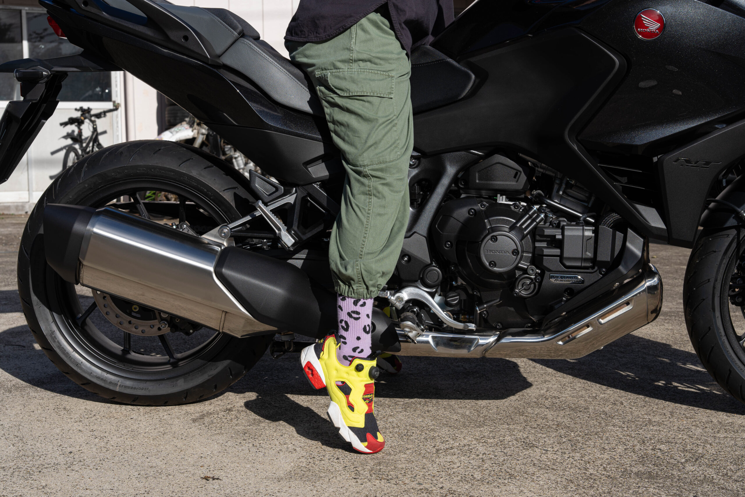 モデルは私の妻で身長155cm。40mmローダウンでも両足のつま先を接地させるのがやっとです。片足ならばある程度安定感が持てそうで、拇指球が着いています。