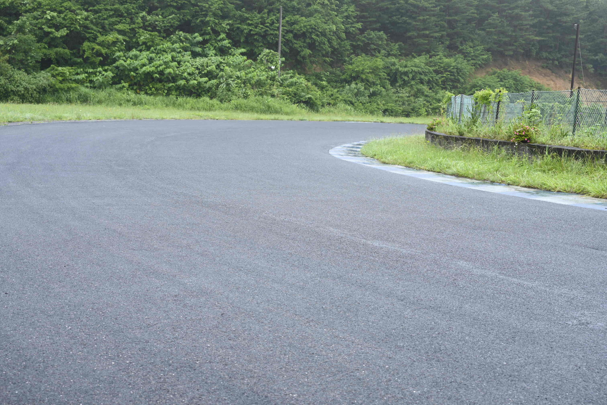 緩い左からキツく回り込む複合コーナーです。曲がりそこねると外側の段のある縁石に乗り上げ、怖い思いをしますので、気をつけています。ただ怖がって内側に寄ってばかりだと後がきつくなるので、思い切ってアウト側から回り込むようにします。