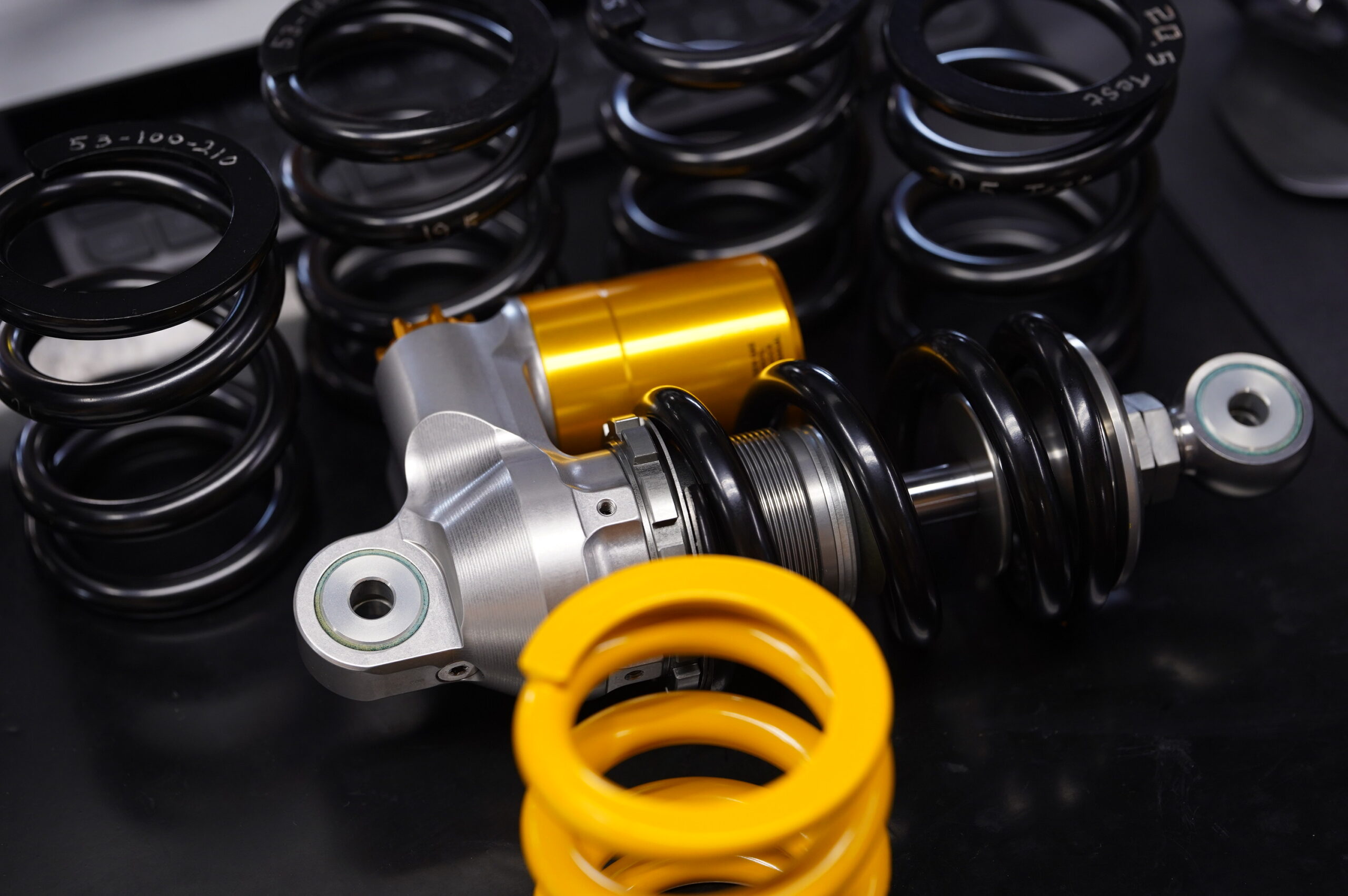 リニアスプリングをセットしての出荷も希望があれば対応します。また、テスト用スプリングは19.5K、20.5Kと21Kを用意しており、使い方やコースに合わせて選んでいただけます。