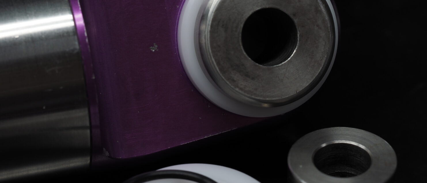 一般に強化ブッシュと呼ばれるPOM(ジュラコン)で造っています。20年近く前に造ったブッシュも未だに現役で使えているので、耐久性は申し分ありません。