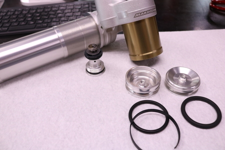 減衰を発生させるカートリッジはガスが封入されています。大がかりな特殊工具がなければガスを入れられませんが、これは特別な解決策を用意して作業を可能にしていました。2020年型はここを普通の社外ショックのようにガスを入れられるようになっています。