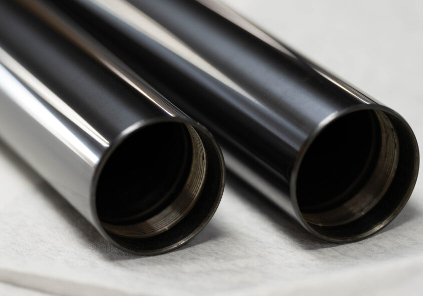 フロントフォークのインナーチューブはリアショックと比較し、太いためコーティングの効果が大きく出来ます。 その理由は”太いから”に集約されますが少し解説ならば…
