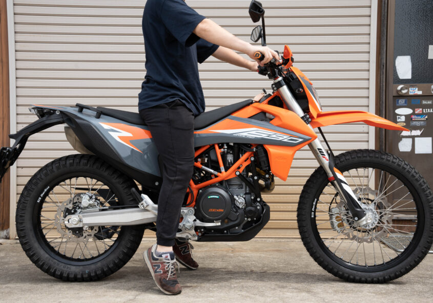 昨日、完成した690エンデューロですが、詳細は後日追記しつつ、動画でも紹介予定ですがとりあえず下がった状態を写真で御覧ください。 身長173cmの中村くん 身…