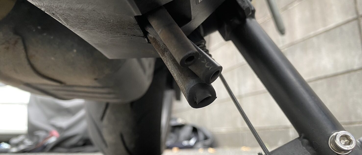 「何度か左コーナーで『何か変な音がしたな』と思うことがあり調べたところ、ドレンホースが原因でした。2cm程度切断した後は音が出ていません。」