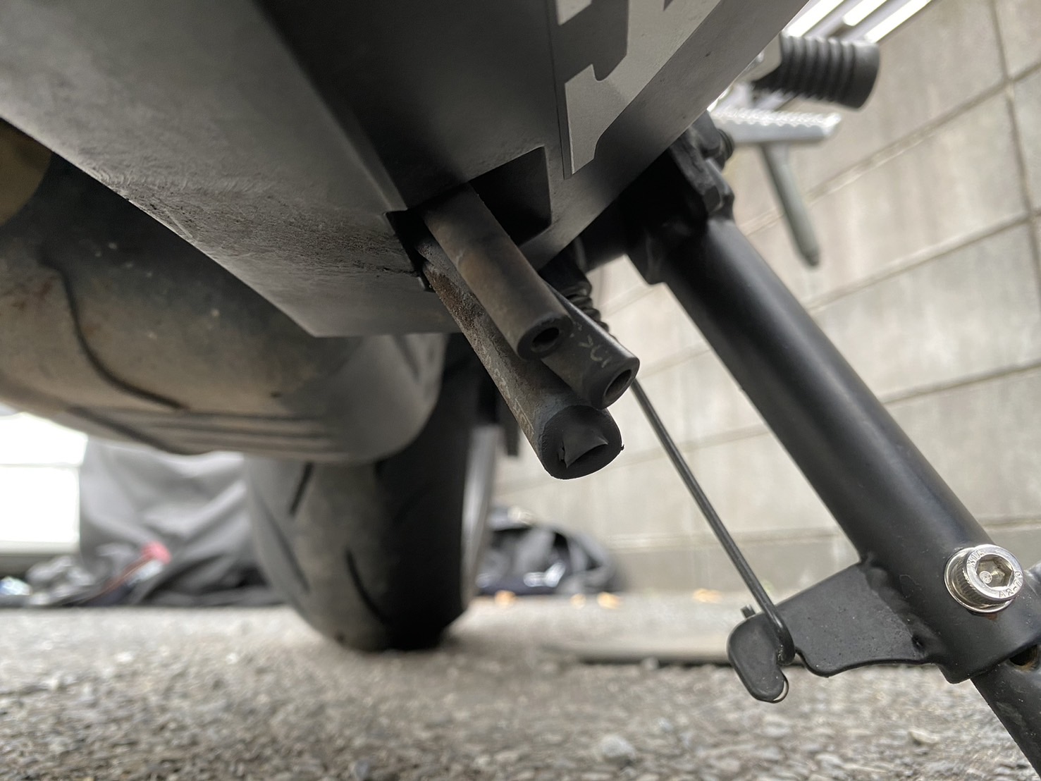 「何度か左コーナーで『何か変な音がしたな』と思うことがあり調べたところ、ドレンホースが原因でした。2cm程度切断した後は音が出ていません。」