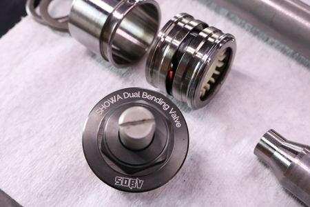 フロントフォークは大掛かりと表せる内容です。カートリッジを追加するだけならそれほどでもありませんが、SDBVと呼ばれる特殊な機構がインナーチューブ先端にあり、それを外すとフォーク長が大きく変化するので、そこの寸法を変えないようにステンレスで部品を作り対応しました。その部品はカシメられ分解ができないようなっています。そこで、一度分解し部品を製作挿入後に当社得意の際カシメで対応できたのは幸いでした。再カシメ以外の手法で長さ合わせを行う方法もありますが、色々と面倒もあり今回はこの手法を用いました。