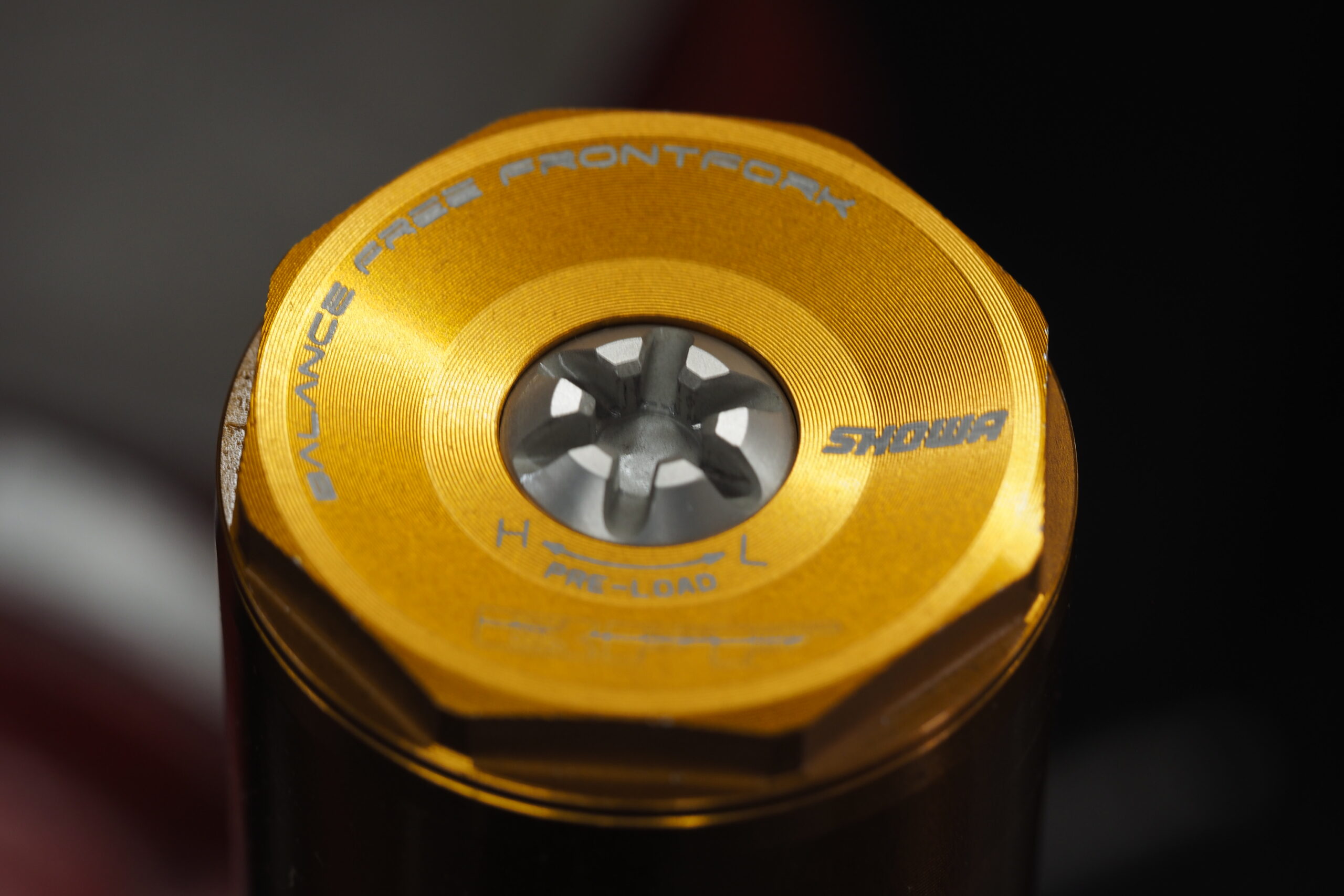 トップキャップにあるイニシャルアジャスターはマイナスではなく純正工具にもある一般的なヘキサゴンレンチで回せるようになっていますよ。