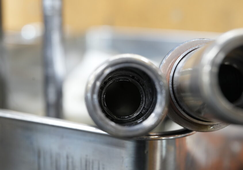 車体で預かり作業中のGSX-R750に使われているヨシムラSHOWAフロントフォークで、大きな問題が発生していました。 写真中央の部品、3つの穴が90°ずつ…