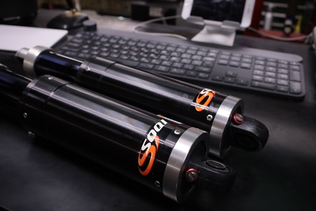 黒くコーティングされたインナーチューブのような筒と、アウターチューブのようなアルミシリンダをみると、まるでフォルナレスのようなエアスプリング式のショックかと思えます。写真をご覧いただければわかりますが、実は見た目をエアスプリングのように似せた、普通のコイルスプリングショックでした。