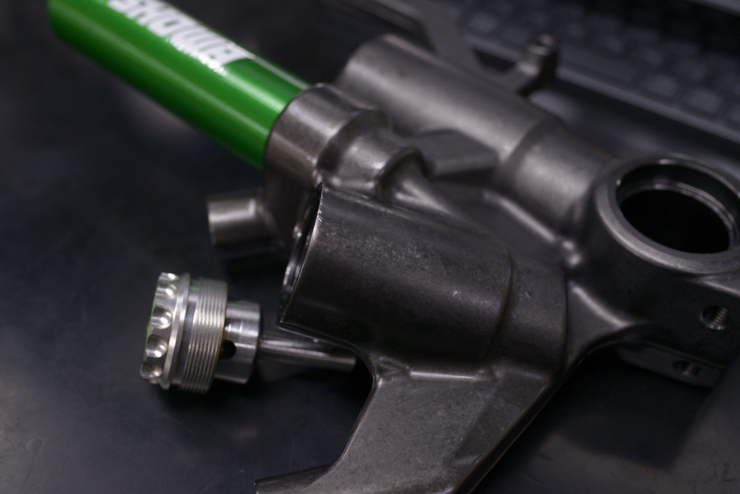 普段は分解しないリザーブタンクの取り付け部分は、汚れが溜まっていました。このフロントフォークは部品点数が多く、複雑な造りをしています。Oリングの使用個数も多いのでかなり工数がかかる高額な作業です。それでも車両本来の良さに加え、フロントフォークに関して抱える悩みを解消したいという欲求からか、数多く依頼を頂いております。
